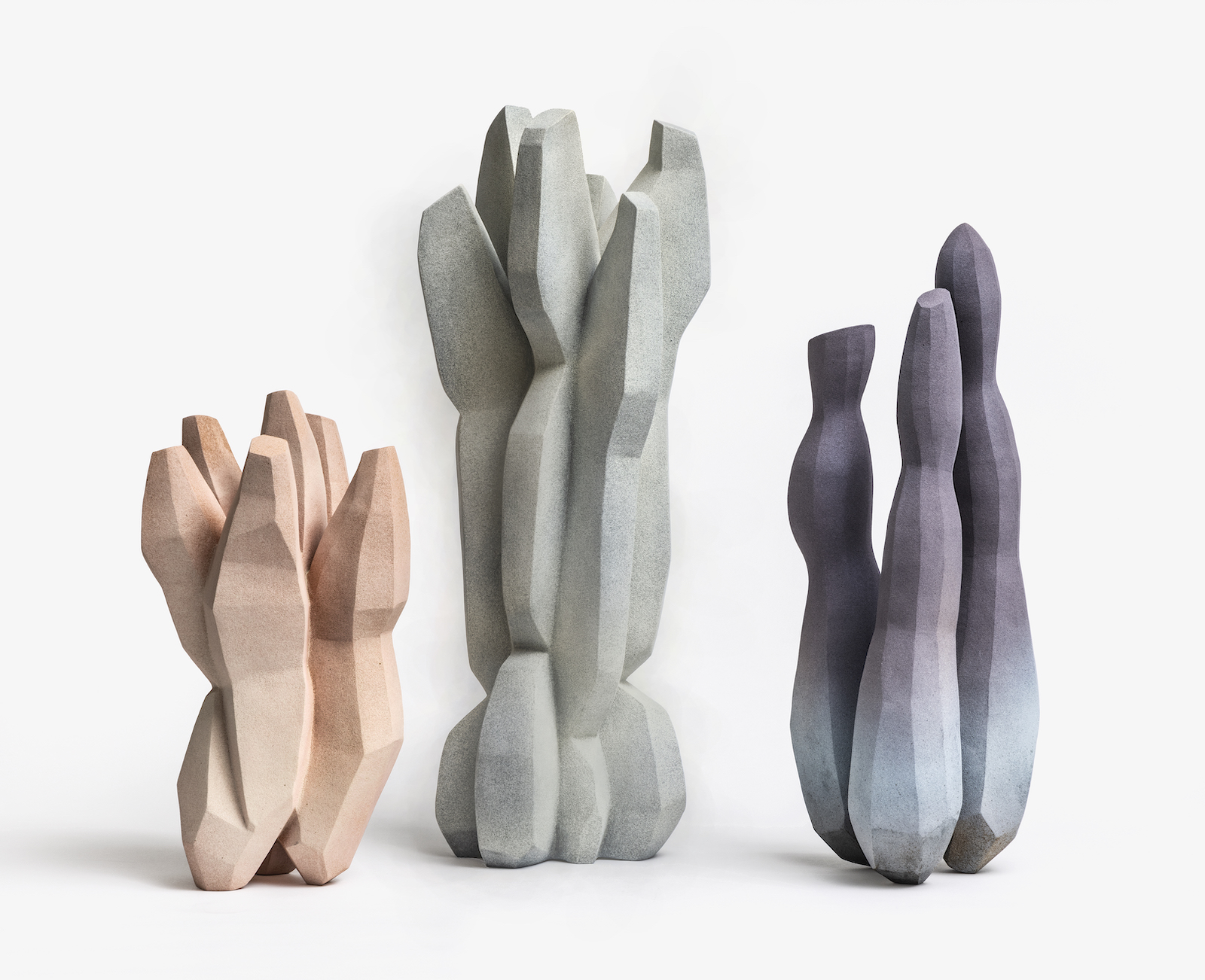 The works are modelled in stoneware clay and glazed with slip glaze, which gives a dry stone-like surface with a rich texture. The angular shapes fight against the nature of the clay, and you sense the hand built. In this way, the angular shapes take on a softer look, leading the mind towards natural forms rather than constructions.
