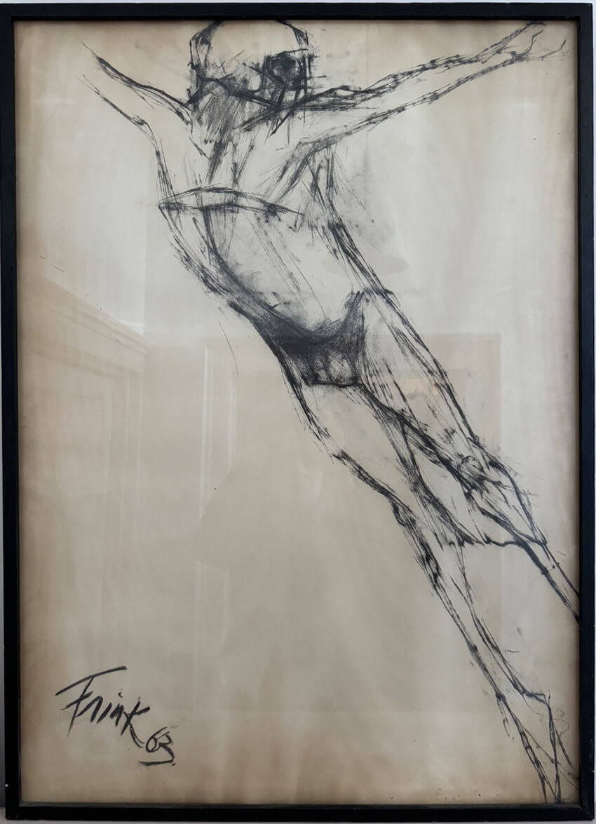 Frink said that the year 1963-4 was a key year for her, as the works she produced at this time represented the culmination of her work to that point. Her early work had idolised the figure of the warrior, inspired by her father, a cavalry officer, whom she hero-worshipped. As a child, Frink fetishised military subjects, inspired by the glamour of uniforms and thoughtless bravery. However, after the war, which left her, in her own words, ‘emotionally disturbed’, she began to see war as the ultimate expression of evil and the warrior as a tragic pawn in the game of politics and brutality. In this drawing, the figure wears a helmet reminiscent of that adorning the head of her ‘Warrior’ sculpture of 1954, yet the contrast between the two is stark. Whereas the 1954 sculpture is strong in physique and stance, boldly stepping forward in defiance of fear, the figure in the drawing appears thin, naked and helpless, much like the ‘Birdman’ sculptures of the late 1950s and early 60’s, falling or spinning out of control, plummeting to earth. The ‘Birdmen’ were partially inspired by the famous French stunt performer, Léo Valentin, who died in May 1956, falling 9,000 ft from an aeroplane, strapped to shattered wooden wings and a parachute that failed to open. A real-life Icarus. Frink’s interest in the subject of human fragility and our uncanny ability to place ourselves in situations of our own making in which we have no control over our faits was intensified by her awareness of the acceleration of the international ‘space race’, and the first human space flight conducted by the Russian astronaut Yuri Gagarin in 1963. For Frink, the idea of humans floating in the vast unknowable darkness of space was the perfect metaphor for the ultimate solitude of humankind and our persistent pushing of the boundaries of the natural order. The final key detail in the work is the cruciform position of the figure. In 1962, Frink was commissioned to make a crucifix for Basil Spence’s lectern in Coventry Cathedral. There followed a series of works on the theme of Christ and the notion of existential martyrdom, which began to dominate her work throughout the 1960s, ‘70s and ‘80s.