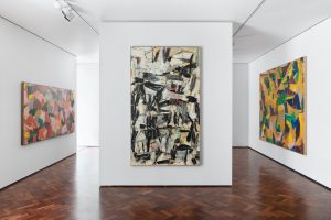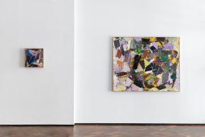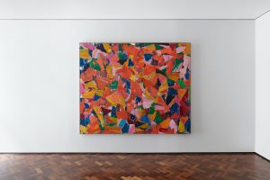 This exhibition was the debut presentation of a new body of paintings by Tom Robinson at Messums London following the success of his inaugural solo show at Messums Wiltshire in 2021. Robinson’s process is rooted in an intuitive approach in which formal elements are manipulated until an image emerges, hovering between stability and the possibility of a further realisation. It is an instinctive yet considered way of working. The paintings start from an inchoate impulse to use a particular colour, movement or tone and, through the process of adding and subtracting, go on to establish a structure and logic of colour. The forms move against each other: coming forwards and receding to create space, and giving the surfaces a three-dimensionality akin to relief sculpture. His paintings often feel compact, elevating rather than mitigating the tension and visceral energy of the fluid, moving paint.