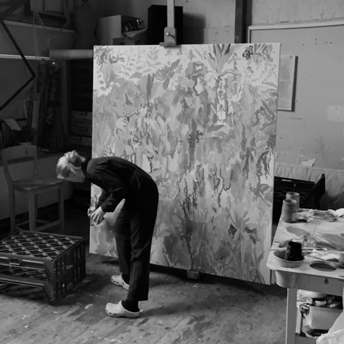 Beatrice Hasell-McCosh‘s work uses natural form as the lens to explore emotional themes, identity linked to place and human connection. Drawing is vital to her practise and she uses closely observed studies made from life to make large-scale paintings in her studio. She works as much from memory as from the studies and, in playing with scale, the focus of importance gives way (from direct figurative representation) to a flattened abstraction of those shapes with aesthetic choices relating to composition, texture and gestural use of colour taking on the primary importance. With a degree in English and Classics reading widely around a subject is important to her practise. The titles of each large work cite the disparate elements of this research from literature to pop culture, song lyrics and art historical links.