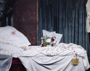 The restaging turned out to be first and foremost a material study of the painting. To do it I worked with a team of people: a professional theatre designer, a textile artist, a florist, a botanist, a makeup artist, a large-format camera operator, two photography technicians and a commercial photographer expert in lighting. Together we unpacked every detail of the painting, from the shininess of the curtains to the colour and length of the fringe on the shawl, to the edges of the pillows, and to the brutal directness of the lighting. It is surprising to see just how much of the story is already told in its setting and embedded in its beddings.